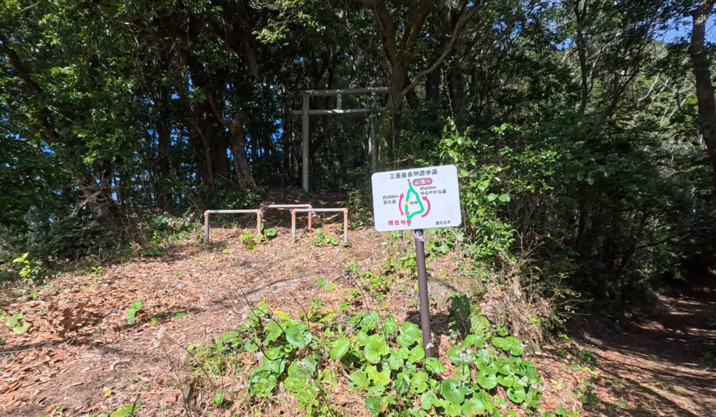 駐車場を出るとすぐに看板が。左の鳥居をくぐると急な道、右がゆるやかな道。